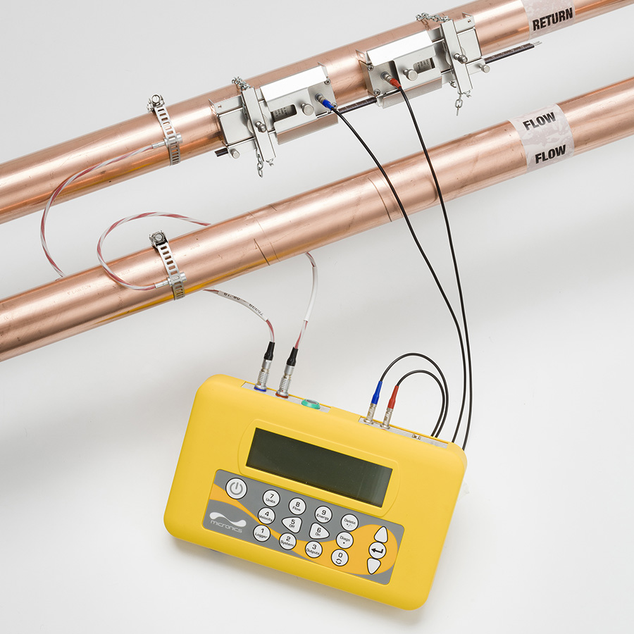Das Messprinzip basiert auf dem Ultraschall - Laufzeitdifferenzverfahren (transit- time). Zur Messung des Durchflusses werden zwei Ultraschall-sensoren (clamp-on-Sensoren) von außen am Rohr montiert. Die Impulse der Sensoren durchlaufen das Rohr und das Medium sowohl mit als auch entgegen der Flussrichtung. Die daraus resultierende Differenz in der Laufzeit zweier entgegengesetzter Signale verhält sich direkt proportional zur Strömungsgeschwindigkeit und kann mithilfe zusätzlicher Rohrparameter als Durchflussvolumen ausgegeben werden.